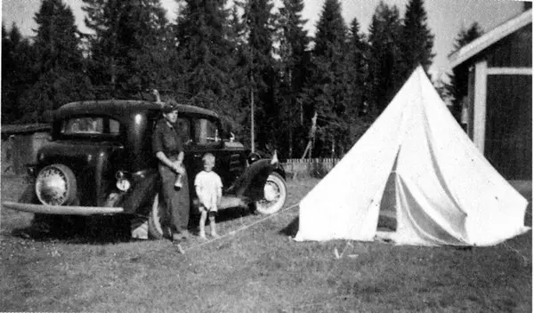 Travelers in front of a car and tent. Foto: Anno Glomdalsmuseet